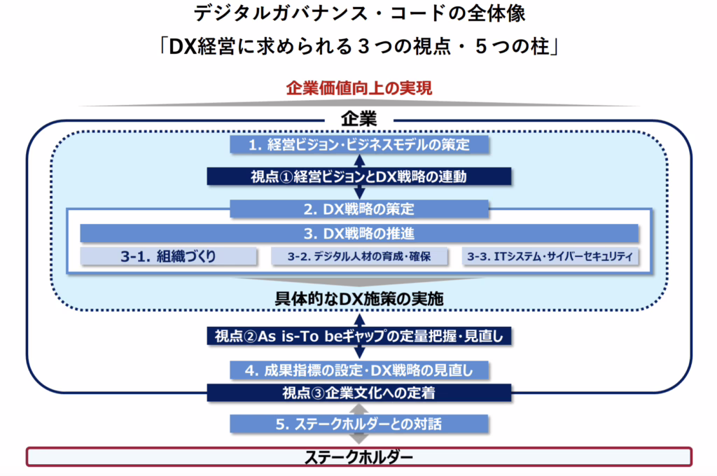 デジタルガバナンス・コードでは、以下の3つの視点と5つの柱が重要視されます。