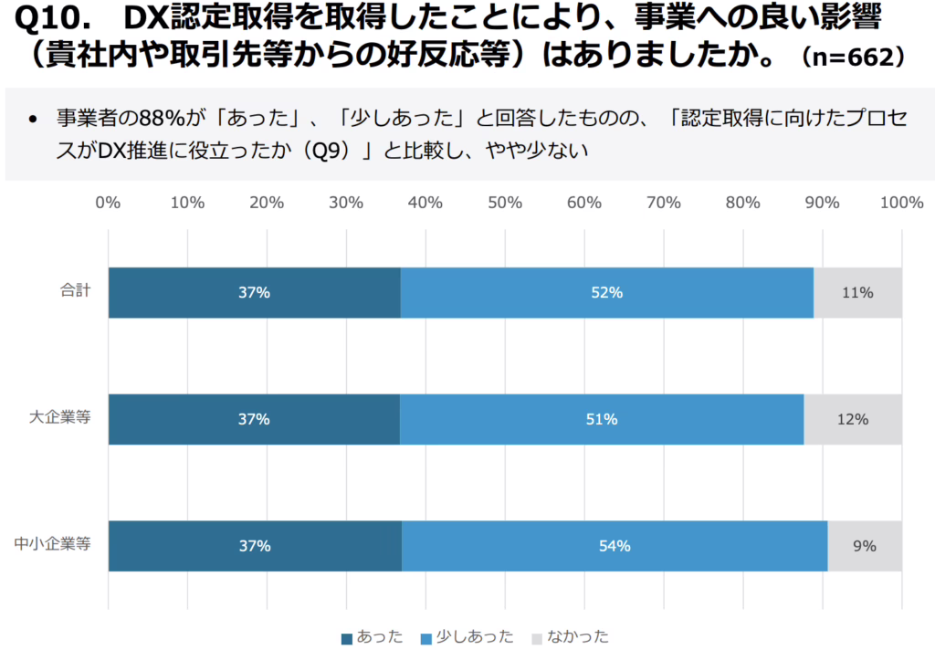 経済産業省が推進する「DX認定制度」を取得すると、ロゴマークを公式に使用でき、取引先や顧客、金融機関に対して信頼感を高めることが可能です。認定後に88%が事業への良い影響があったというアンケート