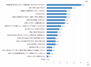 さらに新たな人材を採用・育成するコストも大きくなるため、経営にも大きな負担がかかります。実際に、退職経験者への調査によると、25%が退職理由として「労働環境・条件がよくない」という理由を挙げています。