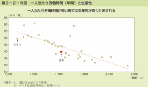 さらに、下の図のように1人あたりの労働時間が短い国では生産性が高いというデータもあります。