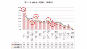 - 資料だけ渡され説明がない:資料がなく口頭説明のみのパターンと、資料はあるが口頭説明がなく引き継ぎがスムーズにいかないケースが同程度ある。資料作成と説明をセットで行う必要性がある。